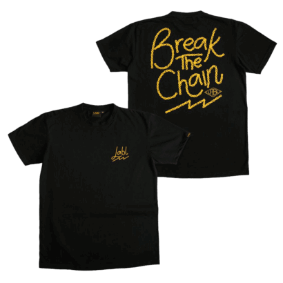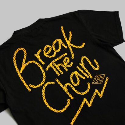 Letters drawn with Chain design. A small logo in the upper left chest and a huge logo at the back. Break the Chain has a deeper meaning than what it seems to be